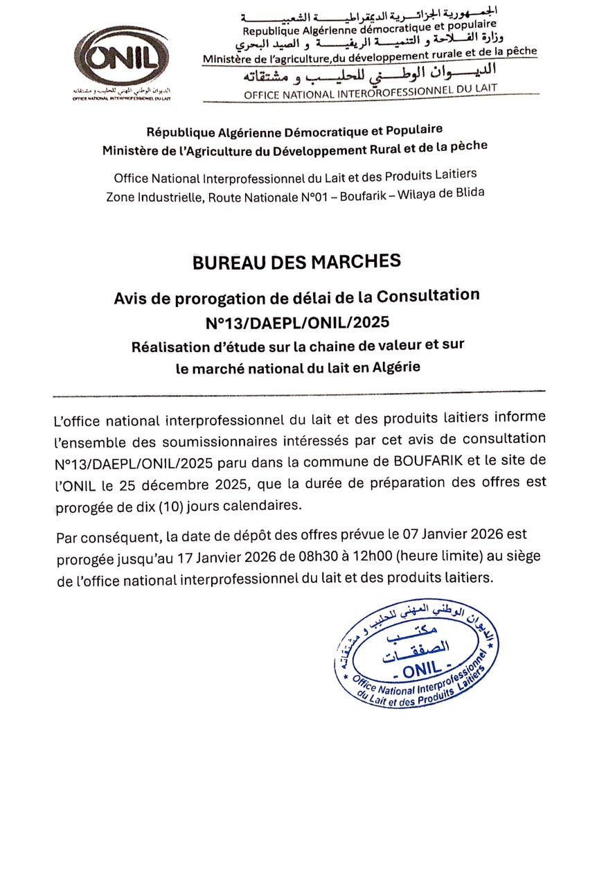 Avis de la Consultation N°13/DAEPL/ONIL/2025 relative à la prestation Sélection d’un cabinet pour la réalisation d’étude sur chaine de valeur et sur le marché national du lait en Algérie.