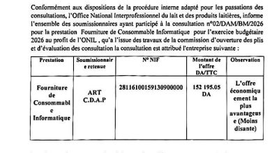 Avis de prorogation de délai de la Consultation N°13/DAEPL/ONIL/2025 Réalisation d’étude sur la chaine de valeur et sur le marché national du lait en Algérie